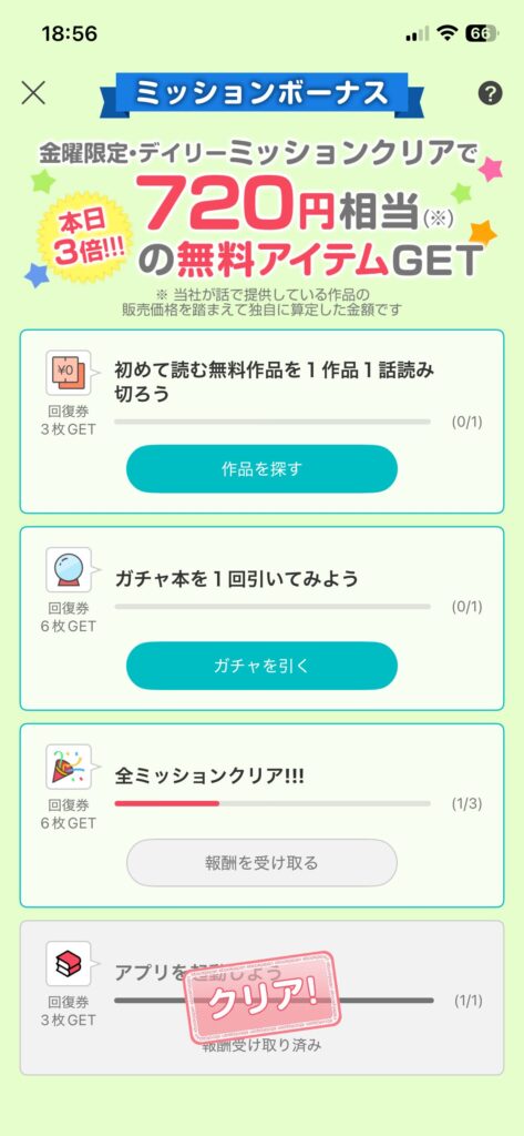 1日1回配布される無料チケットや動画視聴でアイテムを貰って無料分をゲットします。
